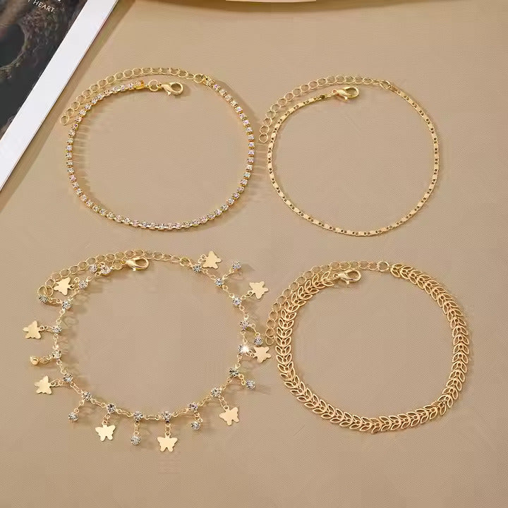 🦋 4-Piece Set – Includes a variety of anklet styles: butterfly charm, zircon tennis chain, and classic gold link designs for versatile styling.