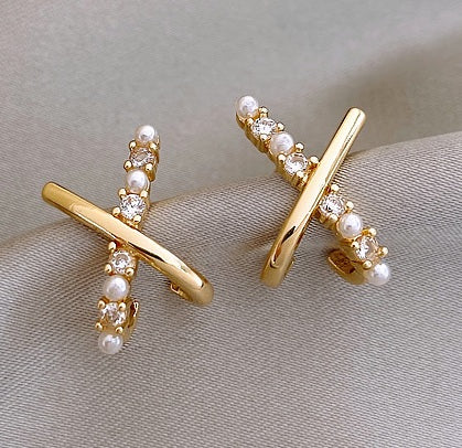 Luxury X-Shape Zircon Pearl Earrings – Cross Design for Women